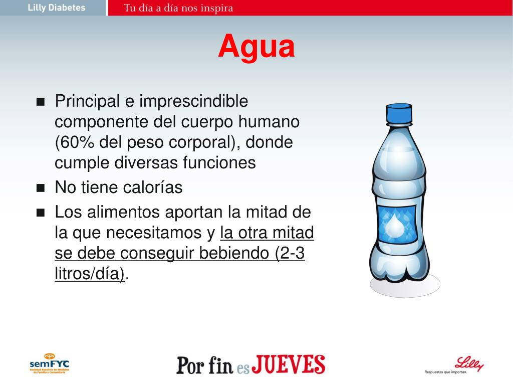Agua • Principal e imprescindible componente del cuerpo humano (60% del peso corporal), donde cumple diversas funciones • No tiene calorías • Los alimentos aportan la mitad de la que necesitamos y la otra mitad se debe conseguir bebiendo (2-3 litros/día).