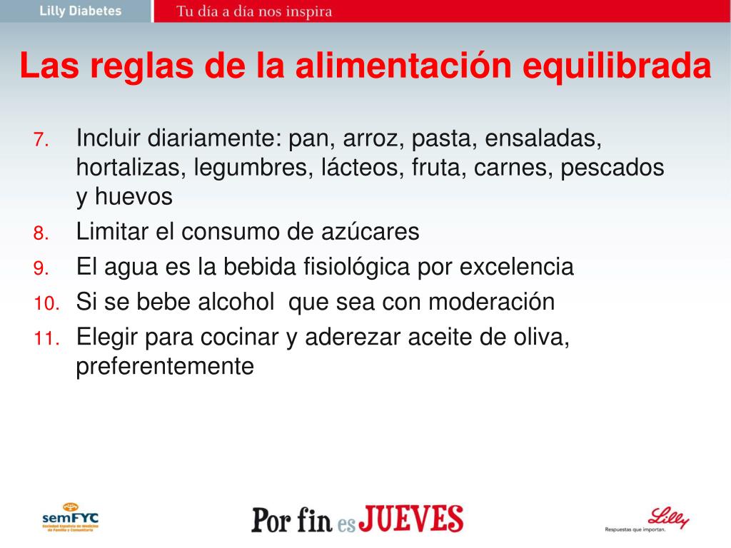 Las reglas de la alimentación equilibrada • Incluir diariamente: pan, arroz, pasta, ensaladas, hortalizas, legumbres, lácteos, fruta, carnes, pescados y huevos • Limitar el consumo de azúcares • El agua es la bebida fisiológica por excelencia • Si se bebe alcohol que sea con moderación • Elegir para cocinar y aderezar aceite de oliva, preferentemente