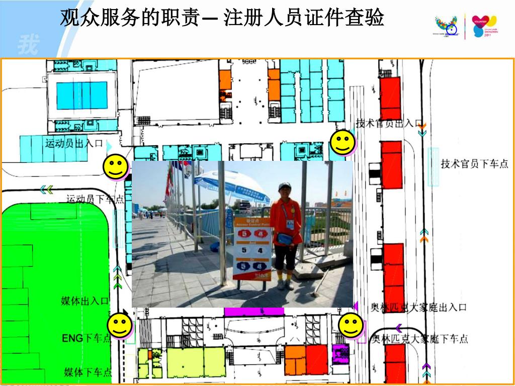 微笑曲线 • 可见度高,哪里有观众,哪里就有我们的微笑 回家休息 出门准备 志 愿 工作结束 抵达场馆 者 上岗前准备 轮岗与休息 工作(微笑)中