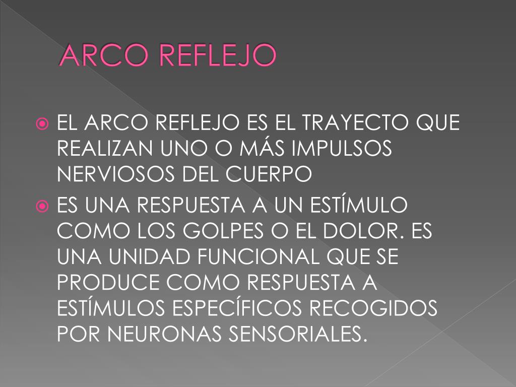 ARCO REFLEJO • EL ARCO REFLEJO ES EL TRAYECTO QUE REALIZAN UNO O MÁS IMPULSOS NERVIOSOS DEL CUERPO • ES UNA RESPUESTA A UN ESTÍMULO COMO LOS GOLPES O EL DOLOR. ES UNA UNIDAD FUNCIONAL QUE SE PRODUCE COMO RESPUESTA A ESTÍMULOS ESPECÍFICOS RECOGIDOS POR NEURONAS SENSORIALES.