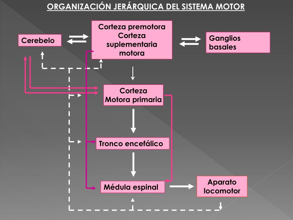 ORGANIZACIÓN JERÁRQUICA DEL SISTEMA MOTOR Corteza premotora Corteza suplementaria motora Ganglios basales Cerebelo Corteza Motora primaria Tronco encefálico Aparato locomotor Médula espinal