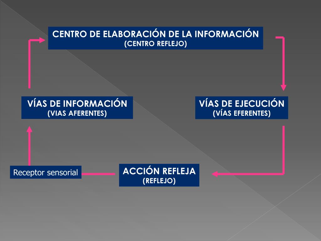 CENTRO DE ELABORACIÓN DE LA INFORMACIÓN (CENTRO REFLEJO) VÍAS DE INFORMACIÓN (VIAS AFERENTES) VÍAS DE EJECUCIÓN (VÍAS EFERENTES) ACCIÓN REFLEJA (REFLEJO) Receptor sensorial