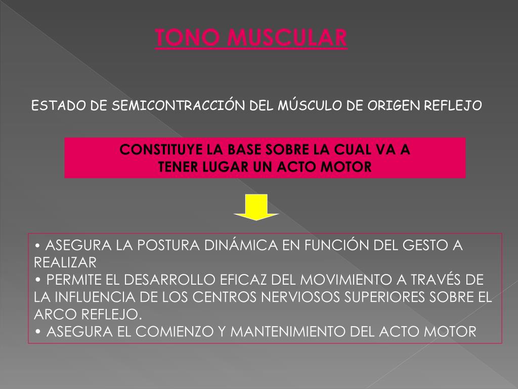 TONO MUSCULAR ESTADO DE SEMICONTRACCIÓN DEL MÚSCULO DE ORIGEN REFLEJO CONSTITUYE LA BASE SOBRE LA CUAL VA A TENER LUGAR UN ACTO MOTOR • ASEGURA LA POSTURA DINÁMICA EN FUNCIÓN DEL GESTO A REALIZAR • PERMITE EL DESARROLLO EFICAZ DEL MOVIMIENTO A TRAVÉS DE LA INFLUENCIA DE LOS CENTROS NERVIOSOS SUPERIORES SOBRE EL ARCO REFLEJO. • ASEGURA EL COMIENZO Y MANTENIMIENTO DEL ACTO MOTOR