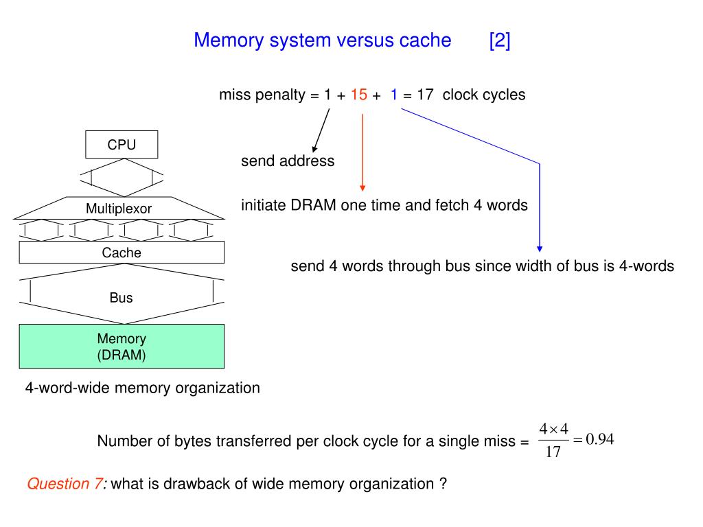Memory system versus cache [2] miss penalty = 1 + 15 + 1 = 17 clock cycles CPU send address initiate DRAM one time and fetch 4 words Multiplexor Cache send 4 words through bus since width of bus is 4-words Bus Memory (DRAM) 4-word-wide memory organization Number of bytes transferred per clock cycle for a single miss = Question 7: what is drawback of wide memory organization ?
