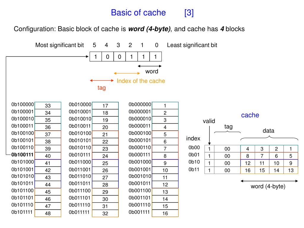 Basic of cache [4] Question 4: is data with address 0b100111 in the cache? Index of the cache tag word Most significant bit 5 4 3 2 1 0 Least significant bit 1 0 0 1 1 1 cache valid tag 2 data 2 index 0b00 1 00 4 3 2 1 0b01 1 00 8 7 6 5 0b10 1 00 12 11 10 9 0b11 1 00 16 15 14 13 word (4-byte) 00 10 = 1 0 miss 0