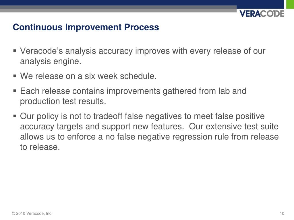 Continuous Improvement Process • Veracode’s analysis accuracy improves with every release of our analysis engine. • We release on a six week schedule. • Each release contains improvements gathered from lab and production test results. • Our policy is not to tradeoff false negatives to meet false positive accuracy targets and support new features. Our extensive test suite allows us to enforce a no false negative regression rule from release to release.