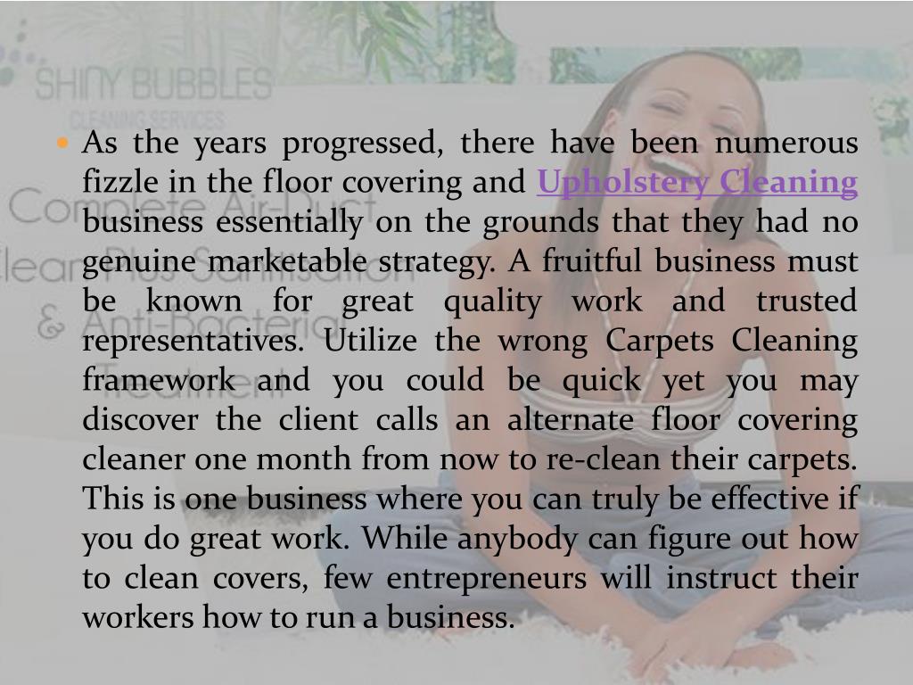 As the years progressed, there have been numerous fizzle in the floor covering and Upholstery Cleaning business essentially on the grounds that they had no genuine marketable strategy. A fruitful business must be known for great quality work and trusted representatives. Utilize the wrong Carpets Cleaning framework and you could be quick yet you may discover the client calls an alternate floor covering cleaner one month from now to re-clean their carpets. This is one business where you can truly be effective if you do great work. While anybody can figure out how to clean covers, few entrepreneurs will instruct their workers how to run a business.