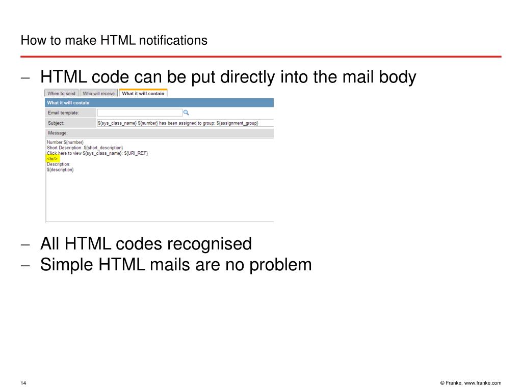 Howtomake HTML notifications • HTML codecanbeputdirectlyintothemailbody • All HTML codesrecognised • Simple HTML mailsarenoproblem
