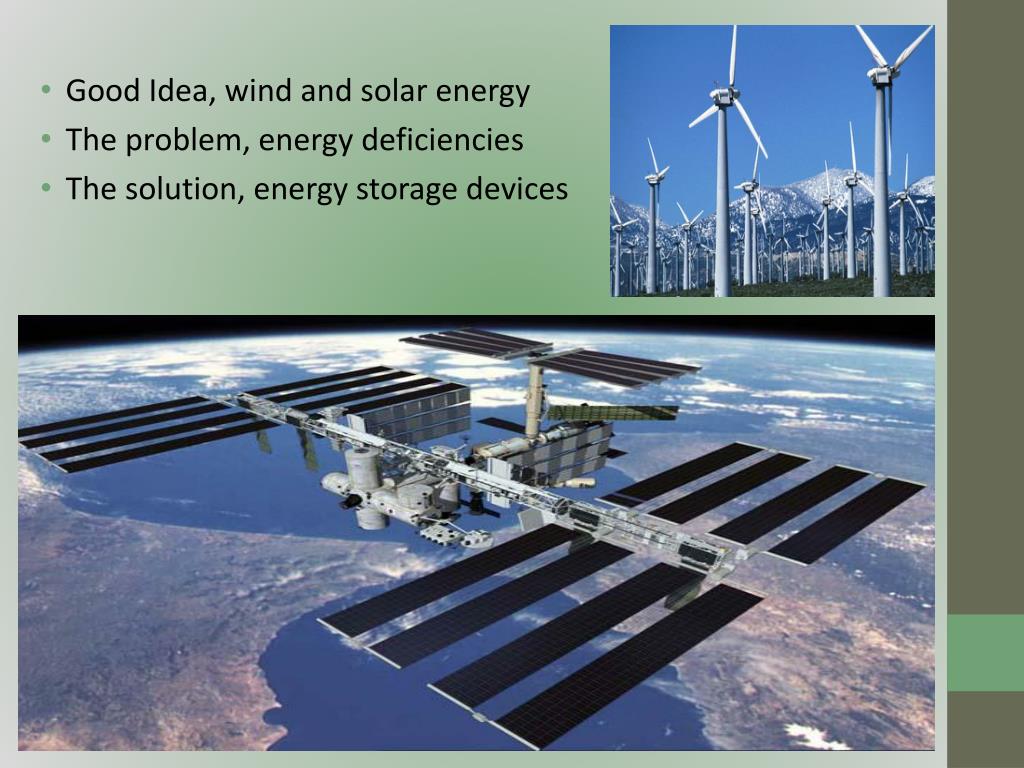 Good Idea, wind and solar energy The problem, energy deficiencies The solution, energy storage devices