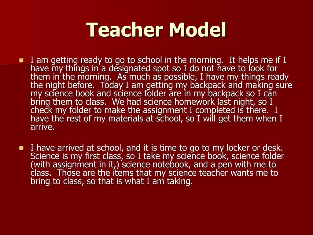 Teacher Model • I am getting ready to go to school in the morning. It helps me if I have my things in a designated spot so I do not have to look for them in the morning. As much as possible, I have my things ready the night before. Today I am getting my backpack and making sure my science book and science folder are in my backpack so I can bring them to class. We had science homework last night, so I check my folder to make the assignment I completed is there. I have the rest of my materials at school, so I will get them when I arrive. • I have arrived at school, and it is time to go to my locker or desk. Science is my first class, so I take my science book, science folder (with assignment in it,) science notebook, and a pen with me to class. Those are the items that my science teacher wants me to bring to class, so that is what I am taking.
