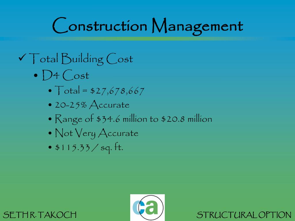 Construction Management ` • Total Building Cost • D4 Cost • Total = $27,678,667 • 20-25% Accurate • Range of $34.6 million to $20.8 million • Not Very Accurate • $115.33 / sq. ft.