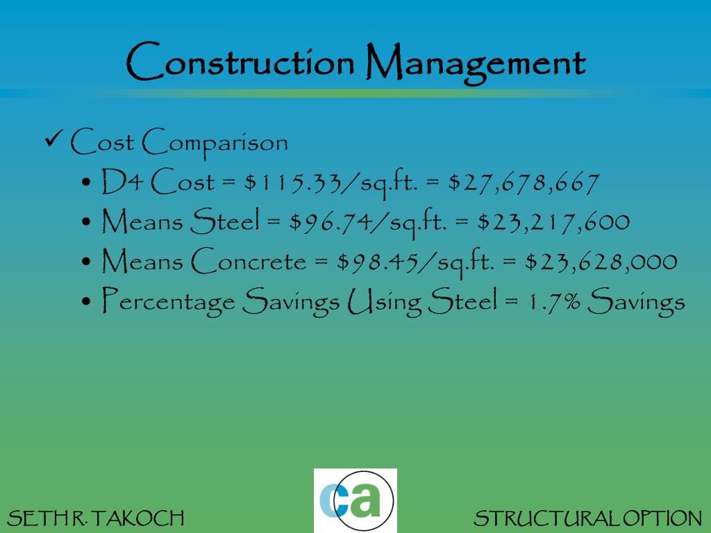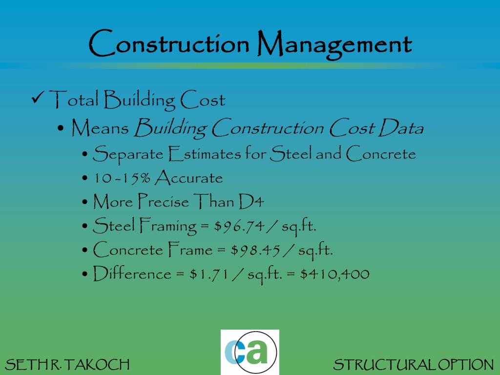 Construction Management ` • Total Building Cost • Means Building Construction Cost Data • Separate Estimates for Steel and Concrete • 10 -15% Accurate • More Precise Than D4 • Steel Framing = $96.74 / sq.ft. • Concrete Frame = $98.45 / sq.ft. • Difference = $1.71 / sq.ft. = $410,400