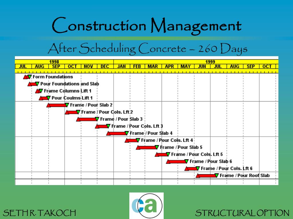 Construction Management ` • Scheduling • Means Data to Calculate Duration • Primavera Utilized to Schedule Sequences • Total Duration Steel Erection = 376days • Total Duration Concrete Placement = 847 days