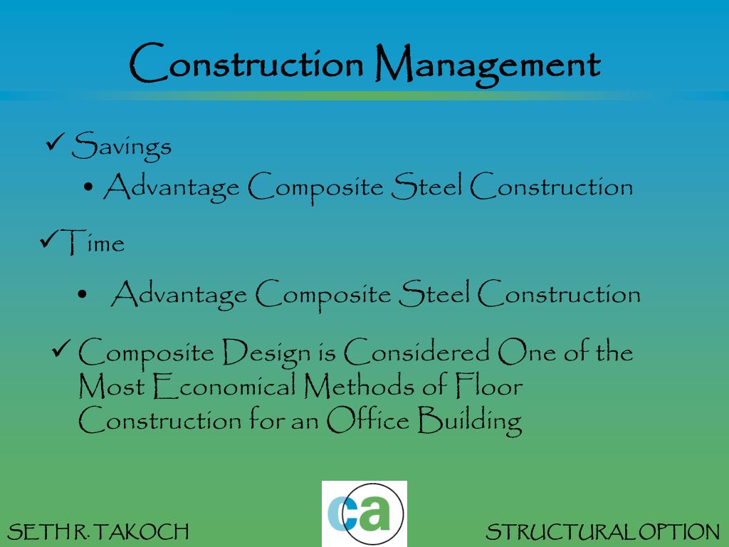 Construction Management ` • Savings • Advantage Composite Steel Construction • Time • Advantage Composite Steel Construction • Composite Design is Considered One of the Most Economical Methods of Floor Construction for an Office Building