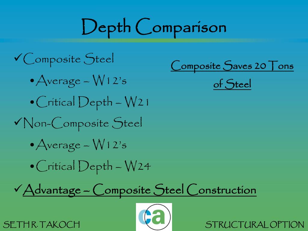 Depth Comparison • Composite Steel • Average – W12’s • Critical Depth – W21 Composite Saves 20 Tons of Steel • Non-Composite Steel • Average – W12’s • Critical Depth – W24 • Advantage – Composite Steel Construction