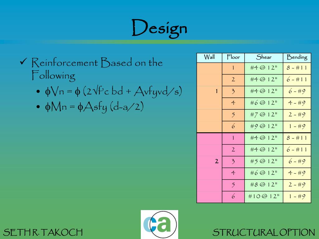 Design • Reinforcement Based on the Following • Vn = (2f’c bd + Avfyvd/s) • Mn = Asfy (d-a/2)