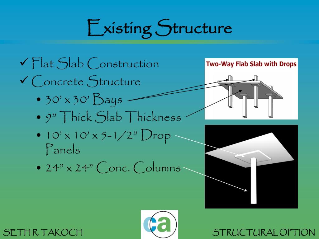 Existing Structure • Flat Slab Construction • Concrete Structure • 30’ x 30’ Bays • 9” Thick Slab Thickness • 10’ x 10’ x 5-1/2” Drop Panels • 24” x 24” Conc. Columns