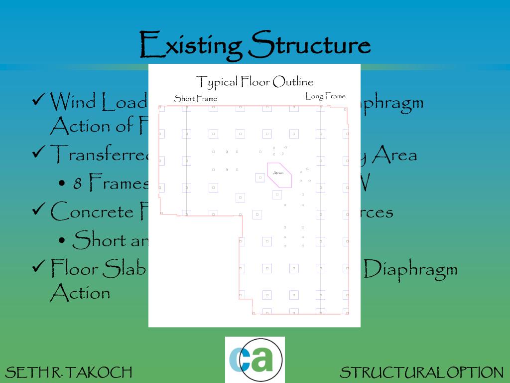 Existing Structure • Wind Loads are Transferred by Diaphragm Action of Façade • Transferred to Framing by Tributary Area • 8 Frames N-S and 9 Frames E-W • Concrete Frames Resist Lateral Forces • Short and Long Frames • Floor Slab Adds Resistance due to Diaphragm Action