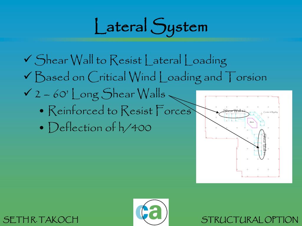 Lateral System • Shear Wall to Resist Lateral Loading • Based on Critical Wind Loading and Torsion • 2 – 60’ Long Shear Walls • Reinforced to Resist Forces • Deflection of h/400