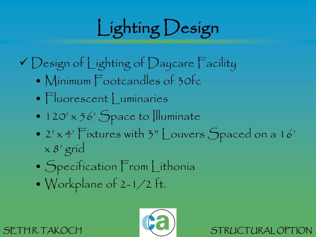 Lighting Design • Design of Lighting of Daycare Facility • Minimum Footcandles of 30fc • Fluorescent Luminaries • 120’ x 56’ Space to Illuminate • 2’ x 4’ Fixtures with 3” Louvers Spaced on a 16’ x 8’ grid • Specification From Lithonia • Workplane of 2-1/2 ft.
