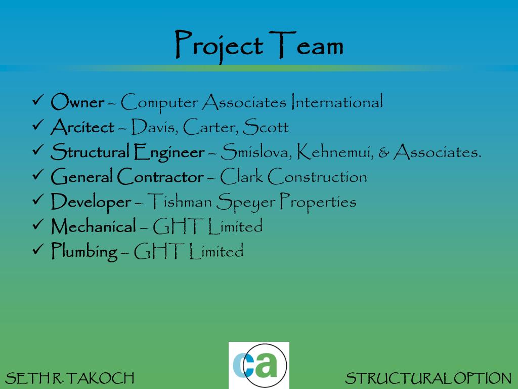 Project Team • Owner – Computer Associates International • Arcitect – Davis, Carter, Scott • Structural Engineer – Smislova, Kehnemui, & Associates. • General Contractor – Clark Construction • Developer – Tishman Speyer Properties • Mechanical – GHT Limited • Plumbing – GHT Limited