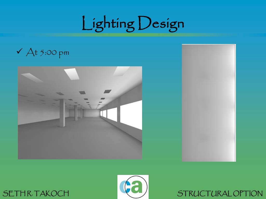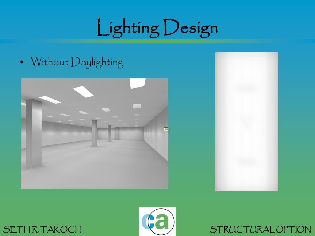Lighting Design • Designed Using Luxicon • Renderings on April 15, 2003 • At 9:00 am with Daylighting • At 1:30 pm with Daylighting • At 5:00 pm with Daylighting • Without Daylighting