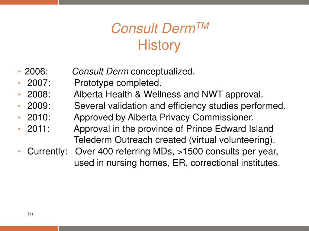 Consult DermTM History • 2006: Consult Derm conceptualized. • 2007: Prototype completed. • 2008: Alberta Health & Wellness and NWT approval. • 2009: Several validation and efficiency studies performed. • 2010: Approved by Alberta Privacy Commissioner. • 2011: Approval in the province of Prince Edward Island Telederm Outreach created (virtual volunteering). • Currently: Over 400 referring MDs, >1500 consults per year, • used in nursing homes, ER, correctional institutes.