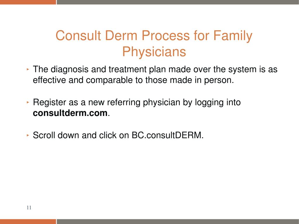 Consult Derm Process for Family Physicians • The diagnosis and treatment plan made over the system is as effective and comparable to those made in person. • Register as a new referring physician by logging into consultderm.com. • Scroll down and click on BC.consultDERM.