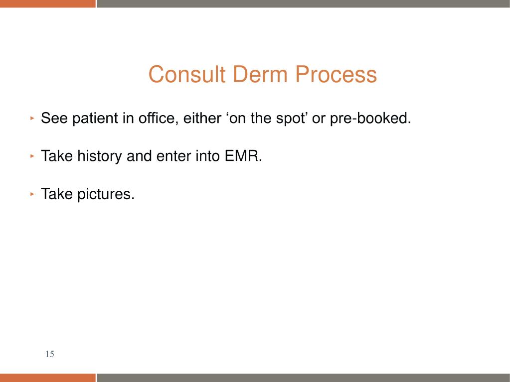Consult Derm Process • See patient in office, either ‘on the spot’ or pre-booked. • Take history and enter into EMR. • Take pictures.
