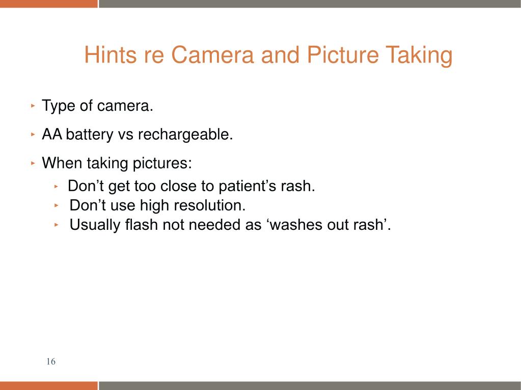 Hints re Camera and Picture Taking • Type of camera. • AA battery vsrechargeable. • When taking pictures: • Don’t get too close to patient’s rash. • Don’t use high resolution. • Usually flash not needed as ‘washes out rash’.
