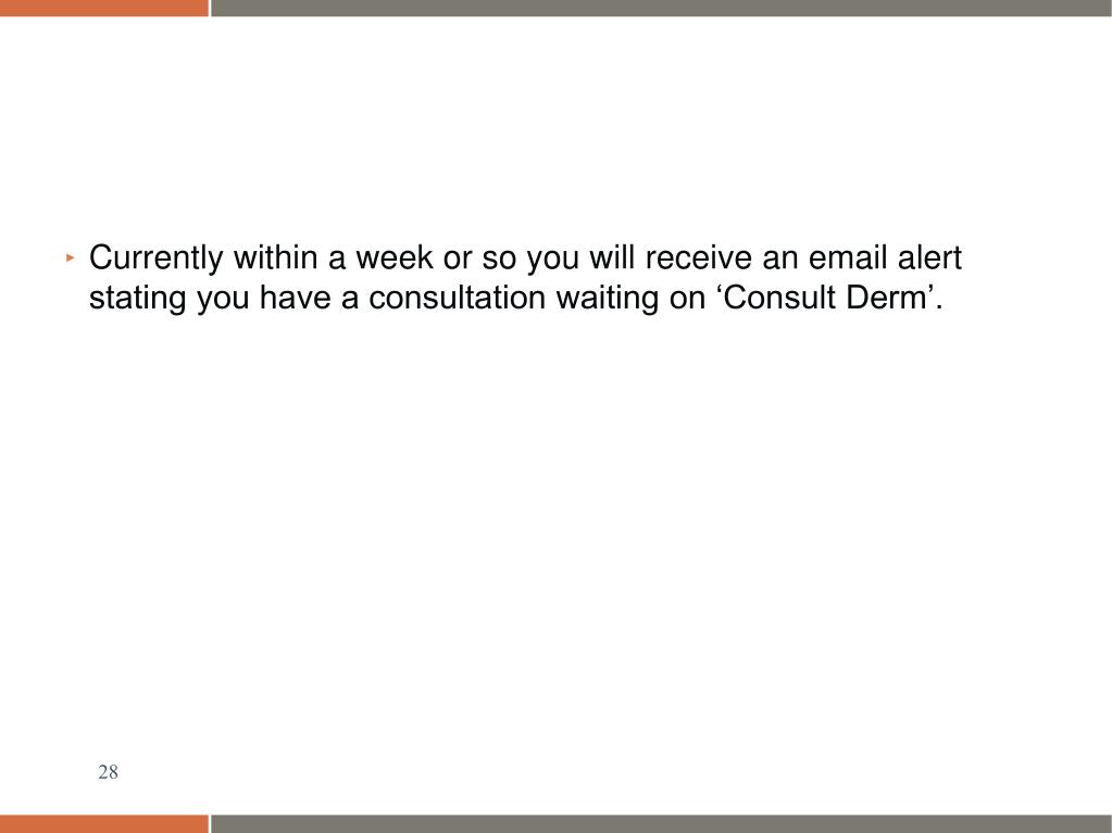 Currently within a week or so you will receive an email alert stating you have a consultation waiting on ‘Consult Derm’.