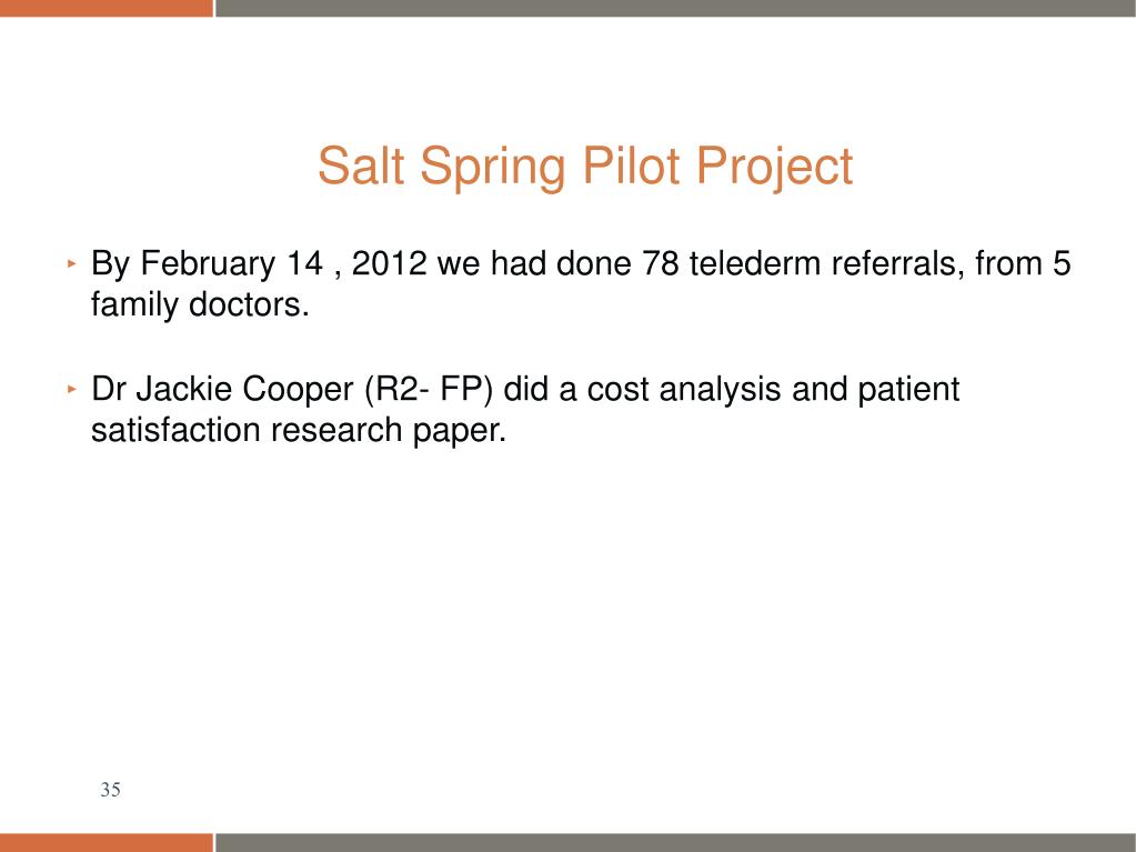 Salt Spring Pilot Project • By February 14 , 2012 we had done 78 telederm referrals, from 5 family doctors. • Dr Jackie Cooper (R2- FP) did a cost analysis and patient satisfaction research paper.