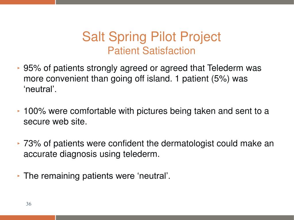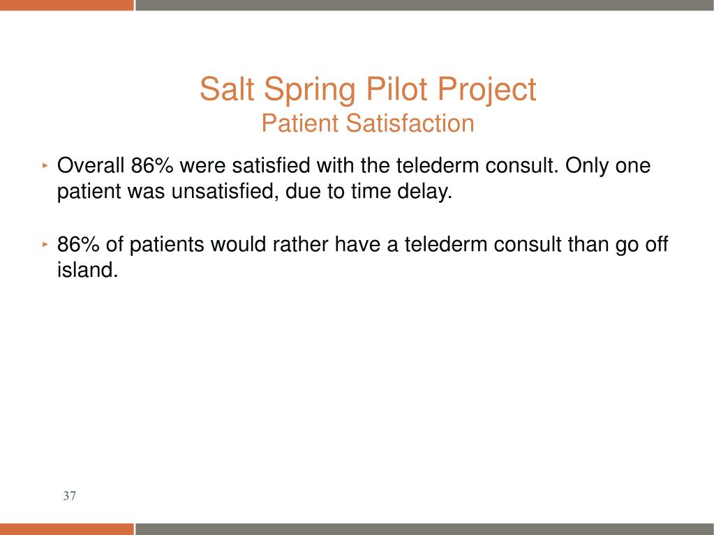 Salt Spring Pilot Project Patient Satisfaction • Overall 86% were satisfied with the telederm consult. Only one patient was unsatisfied, due to time delay. • 86% of patients would rather have a telederm consult than go off island.