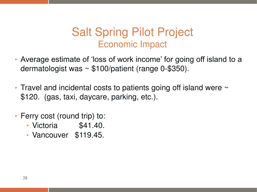 Salt Spring Pilot Project Economic Impact • Average estimate of ‘loss of work income’ for going off island to a dermatologist was ~ $100/patient (range 0-$350). • Travel and incidental costs to patients going off island were ~ $120. (gas, taxi, daycare, parking, etc.). • Ferry cost (round trip) to: • Victoria $41.40. • Vancouver $119.45.