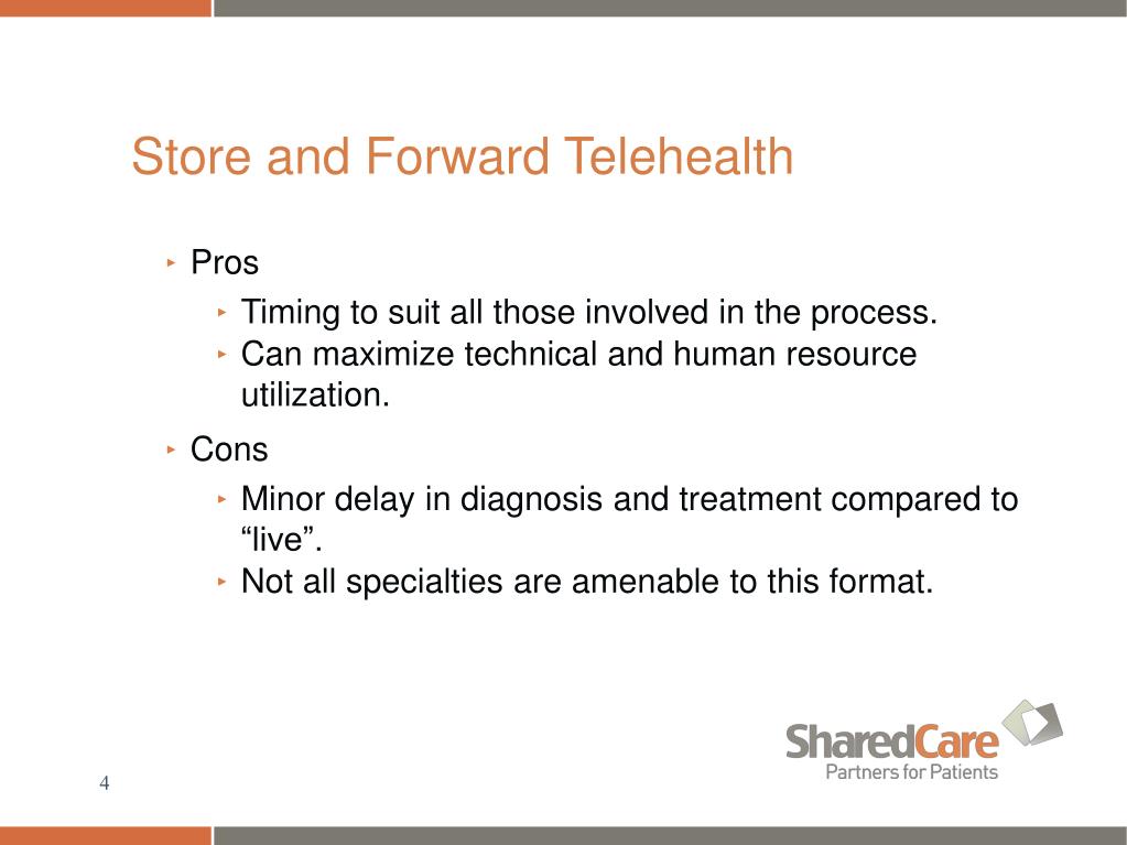 Store and Forward Telehealth • Pros • Timing to suit all those involved in the process. • Can maximize technical and human resource utilization. • Cons • Minor delay in diagnosis and treatment compared to “live”. • Not all specialties are amenable to this format.