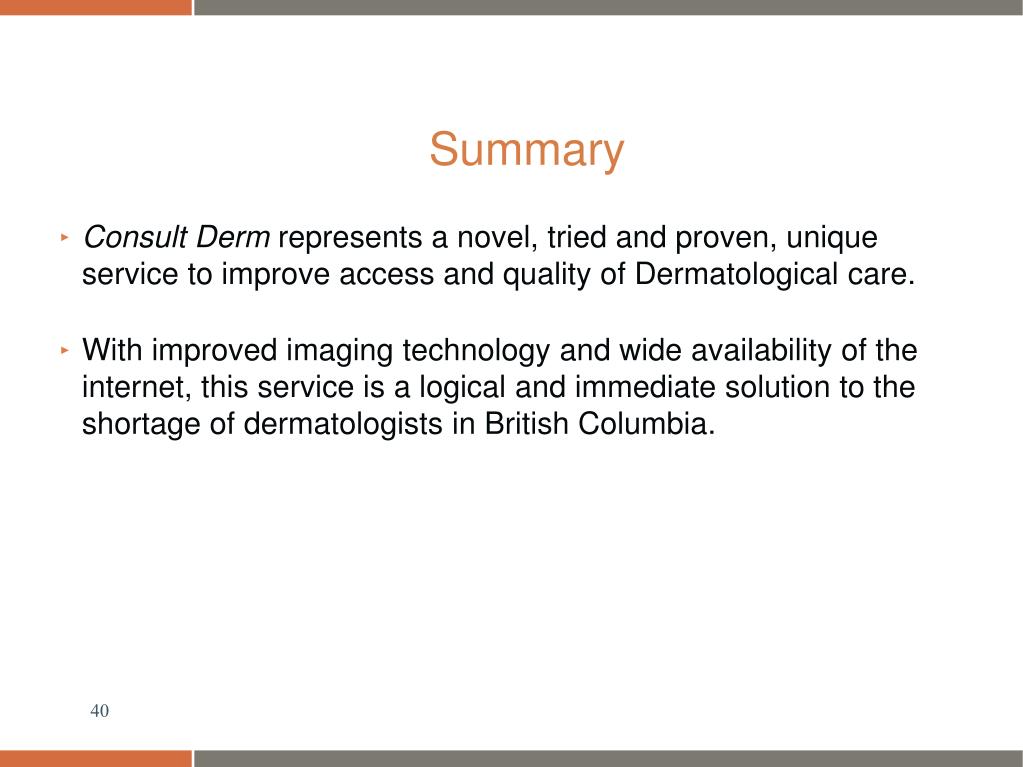 Summary • Consult Derm represents a novel, tried and proven, unique service to improve access and quality of Dermatological care. • With improved imaging technology and wide availability of the internet, this service is a logical and immediate solution to the shortage of dermatologists in British Columbia.