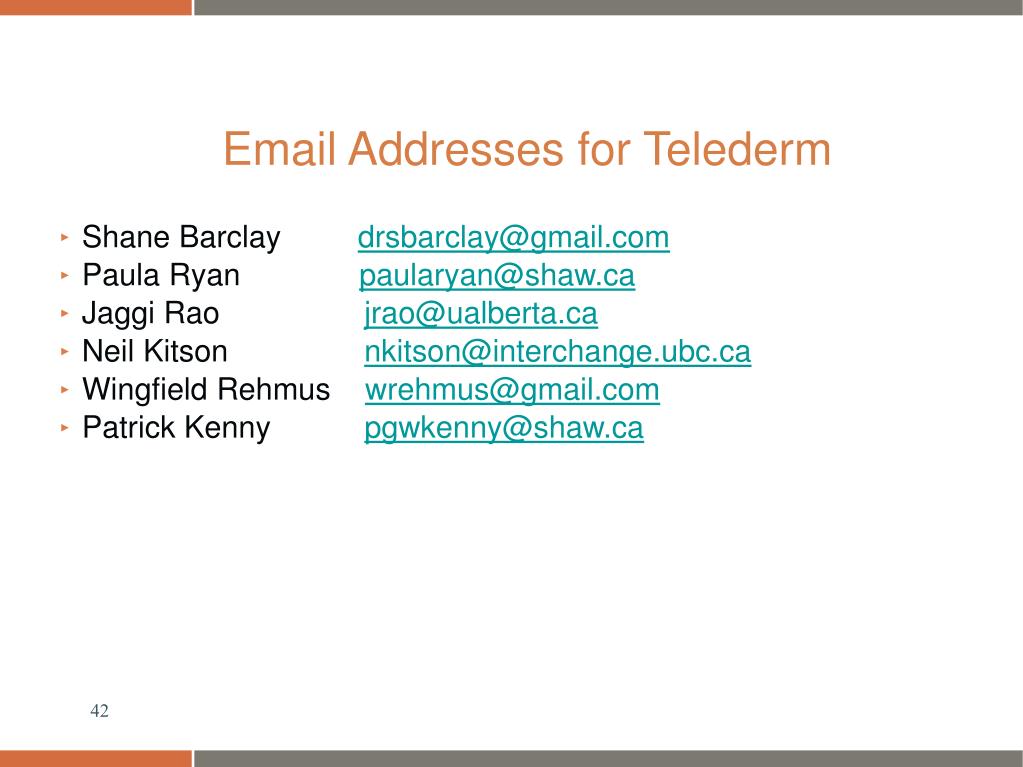 Email Addresses for Telederm • Shane Barclay drsbarclay@gmail.com • Paula Ryan paularyan@shaw.ca • Jaggi Rao jrao@ualberta.ca • Neil Kitson nkitson@interchange.ubc.ca • Wingfield Rehmus wrehmus@gmail.com • Patrick Kenny pgwkenny@shaw.ca