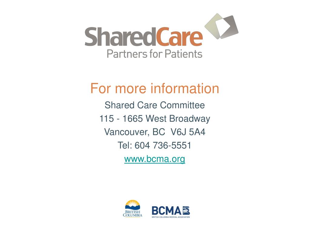 For more information Shared Care Committee 115 - 1665 West Broadway Vancouver, BC V6J 5A4 Tel: 604 736-5551 www.bcma.org
