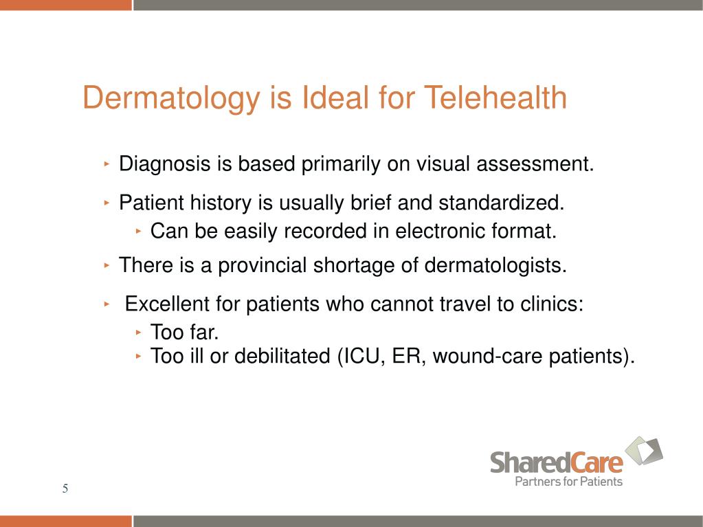 Dermatology is Ideal for Telehealth • Diagnosis is based primarily on visual assessment. • Patient history is usually brief and standardized. • Can be easily recorded in electronic format. • There is a provincial shortage of dermatologists. • Excellent for patients who cannot travel to clinics: • Too far. • Too ill or debilitated (ICU, ER, wound-care patients).