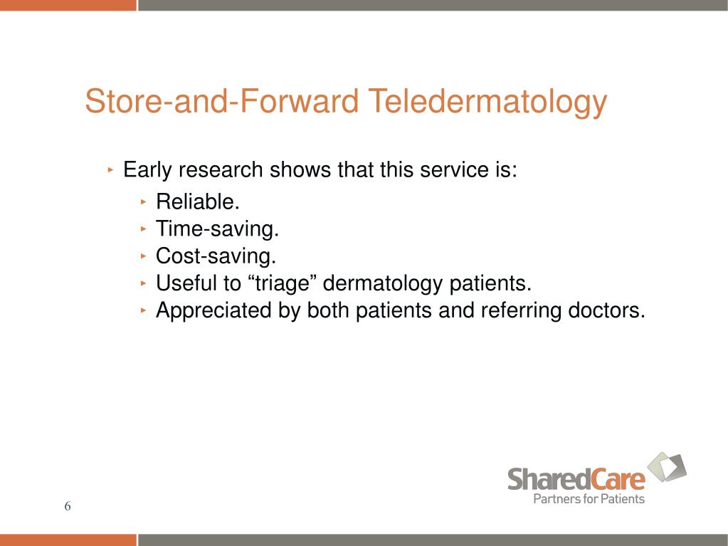 Store-and-Forward Teledermatology • Early research shows that this service is: • Reliable. • Time-saving. • Cost-saving. • Useful to “triage” dermatology patients. • Appreciated by both patients and referring doctors.