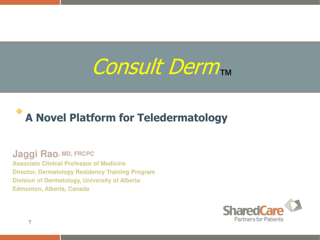 Consult Derm™ • A Novel Platform for Teledermatology Jaggi Rao, MD, FRCPCAssociate Clinical Professor of MedicineDirector, Dermatology Residency Training ProgramDivision of Dermatology, University of AlbertaEdmonton, Alberta, Canada