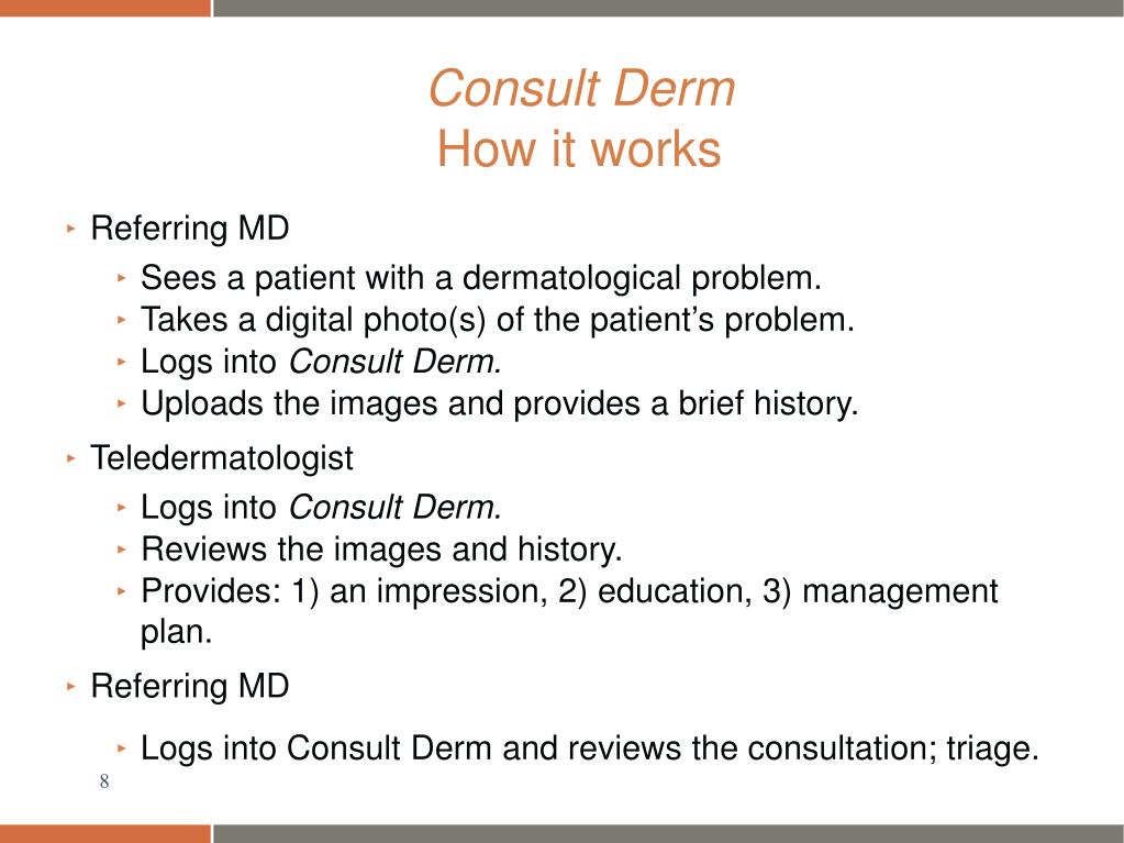 Consult Derm How it works • Referring MD • Sees a patient with a dermatological problem. • Takes a digital photo(s) of the patient’s problem. • Logs into Consult Derm. • Uploads the images and provides a brief history. • Teledermatologist • Logs into Consult Derm. • Reviews the images and history. • Provides: 1) an impression, 2) education, 3) management plan. • Referring MD • Logs into Consult Dermand reviews the consultation; triage.