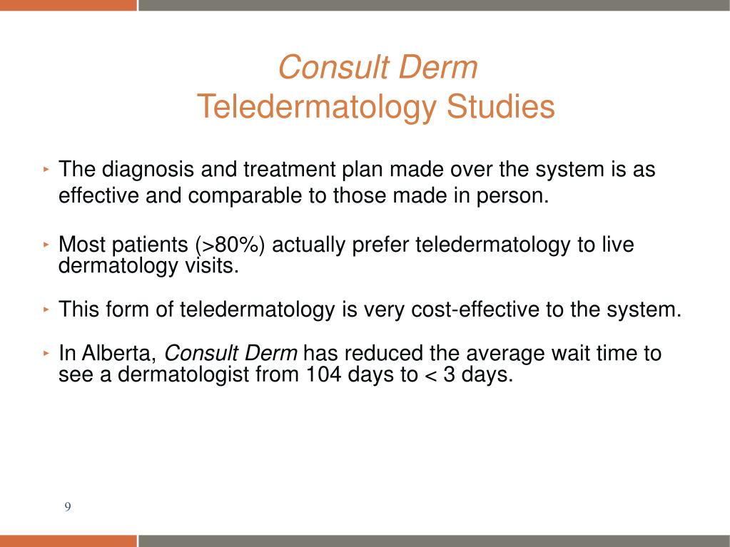 Consult Derm Teledermatology Studies • The diagnosis and treatment plan made over the system is as effective and comparable to those made in person. • Most patients (>80%) actually prefer teledermatology to live dermatology visits. • This form of teledermatology is very cost-effective to the system. • In Alberta, Consult Derm has reduced the average wait time to see a dermatologist from 104 days to < 3 days.