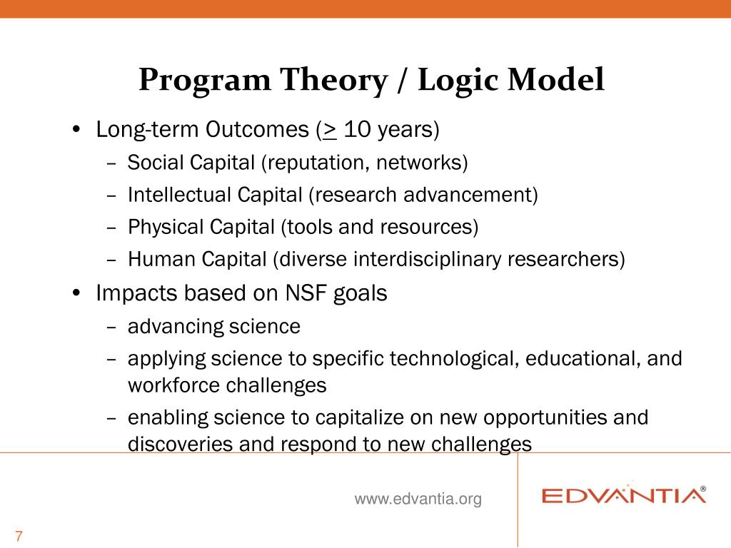 Program Theory / Logic Model • Long-term Outcomes (> 10 years) • Social Capital (reputation, networks) • Intellectual Capital (research advancement) • Physical Capital (tools and resources) • Human Capital (diverse interdisciplinary researchers) • Impacts based on NSF goals • advancing science • applying science to specific technological, educational, and workforce challenges • enabling science to capitalize on new opportunities and discoveries and respond to new challenges