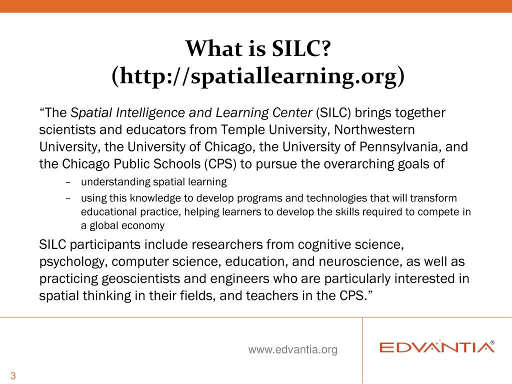 What is SILC? (http://spatiallearning.org) “The Spatial Intelligence and Learning Center (SILC) brings together scientists and educators from Temple University, Northwestern University, the University of Chicago, the University of Pennsylvania, and the Chicago Public Schools (CPS) to pursue the overarching goals of • understanding spatial learning • using this knowledge to develop programs and technologies that will transform educational practice, helping learners to develop the skills required to compete in a global economy SILC participants include researchers from cognitive science, psychology, computer science, education, and neuroscience, as well as practicing geoscientists and engineers who are particularly interested in spatial thinking in their fields, and teachers in the CPS.”