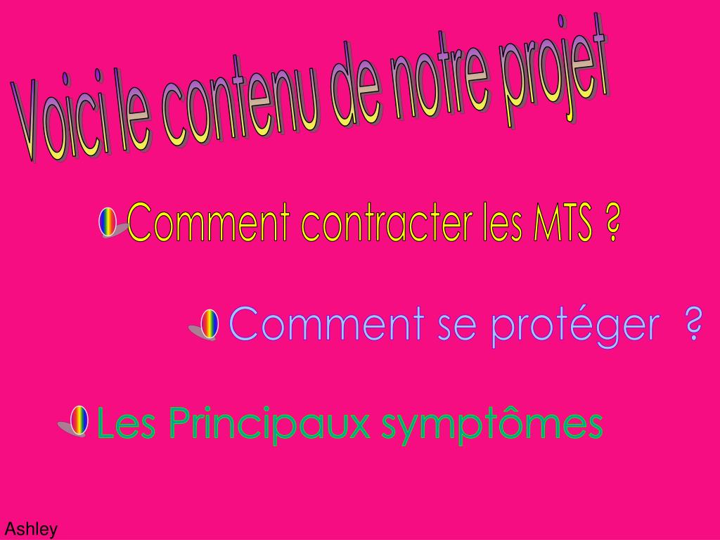 Voici le contenu de notre projet Comment contracter les MTS ? . Comment se protéger ? . . Les Principaux symptômes Ashley