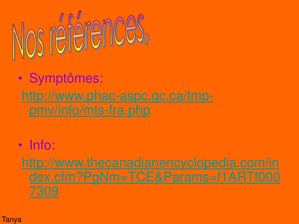 Nos références, • Symptômes: http://www.phac-aspc.gc.ca/tmp-pmv/info/mts-fra.php • Info: http://www.thecanadianencyclopedia.com/index.cfm?PgNm=TCE&Params=f1ARTf0007309 Tanya