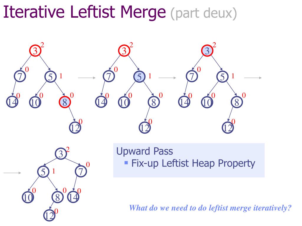 Iterative Leftist Merge (part deux) 2 2 2 3 3 3 0 0 0 1 1 1 7 7 7 5 5 5 0 0 0 0 0 0 0 0 0 14 14 14 8 8 8 10 10 10 0 0 0 12 12 12 2 • Upward Pass • Fix-up Leftist Heap Property 3 0 1 7 5 0 0 0 14 8 10 What do we need to do leftist merge iteratively? 0 12