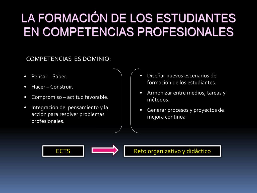 LA FORMACIÓN DE LOS ESTUDIANTES EN COMPETENCIAS PROFESIONALES COMPETENCIAS ES DOMINIO: • Pensar – Saber. • Hacer – Construir. • Compromiso – actitud favorable. • Integración del pensamiento y la acción para resolver problemas profesionales. • Diseñar nuevos escenarios de formación de los estudiantes. • Armonizar entre medios, tareas y métodos. • Generar procesos y proyectos de mejora continua ECTS Reto organizativo y didáctico