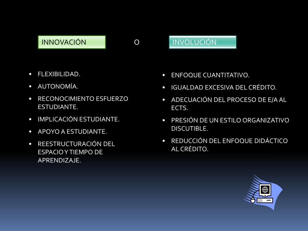 INNOVACIÓN O INVOLUCIÓN • FLEXIBILIDAD. • AUTONOMÍA. • RECONOCIMIENTO ESFUERZO ESTUDIANTE. • IMPLICACIÓN ESTUDIANTE. • APOYO A ESTUDIANTE. • REESTRUCTURACIÓN DEL ESPACIO Y TIEMPO DE APRENDIZAJE. • ENFOQUE CUANTITATIVO. • IGUALDAD EXCESIVA DEL CRÉDITO. • ADECUACIÓN DEL PROCESO DE E/A AL ECTS. • PRESIÓN DE UN ESTILO ORGANIZATIVO DISCUTIBLE. • REDUCCIÓN DEL ENFOQUE DIDÁCTICO AL CRÉDITO.